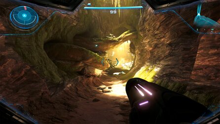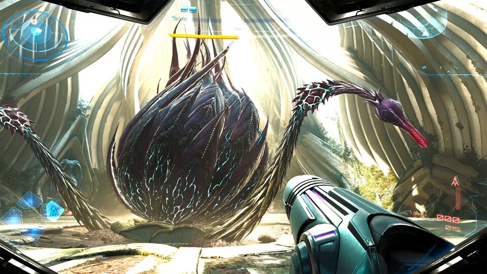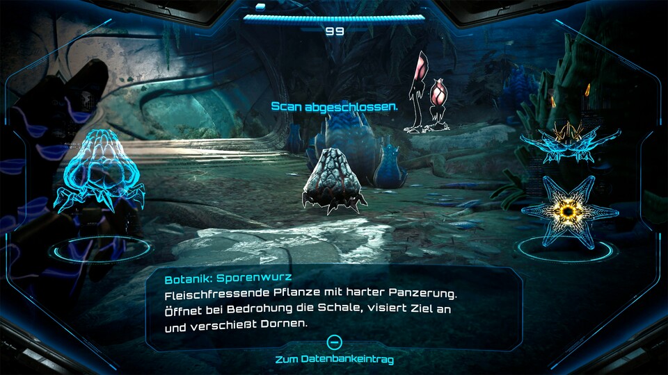Wer Metroid kennt, der weiß zudem: Oft sind es die fremdartigen Umgebungen, die die eigentliche Geschichte erzählen. Wie in den drei Vorgängern lässt sich nämlich wieder alles abscannen, was nicht niet- und nagelfest ist. Türen, Steine, Pflanzen, Gegner, Tiere, …