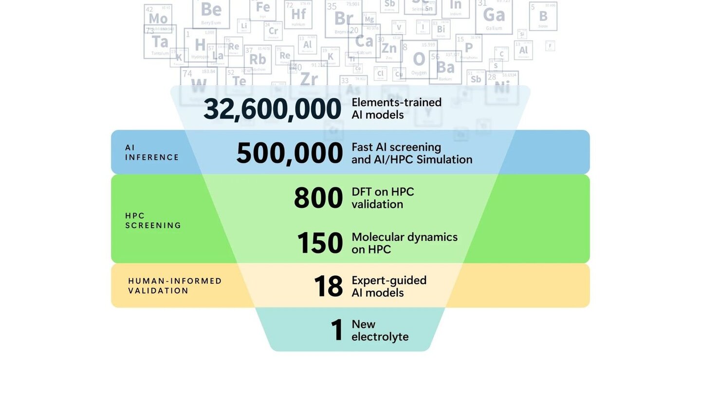 Konkret wurde die KI dazu verwendet, grob vorzufiltern. Der HPC-Cluster von Azure Quantum Elements wiederum kam zum Einsatz, um die Feinarbeiten vorzunehmen, bei denen hohe Präzision erforderlich ist.
