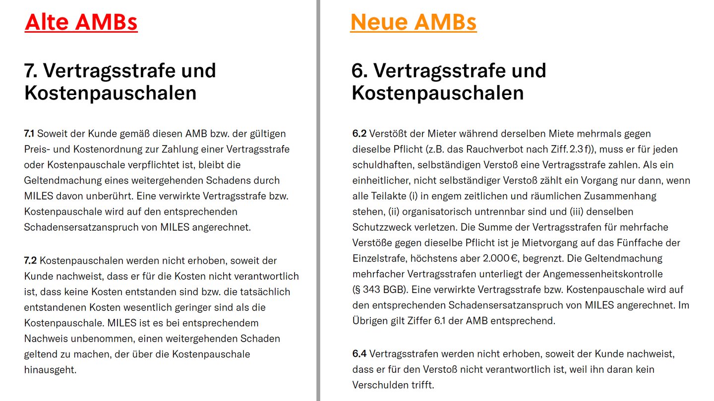 Verstößt der Mieter während derselben Miete mehrmals gegen dieselbe Pflicht (z.B. das Rauchverbot nach Ziff. 2.3 f)), muss er für jeden schuldhaften, selbständigen Verstoß eine Vertragsstrafe zahlen. Als ein einheitlicher, nicht selbständiger Verstoß zählt ein Vorgang nur dann, wenn alle Teilakte (i) in engem zeitlichen und räumlichen Zusammenhang stehen, (ii) organisatorisch untrennbar sind und (iii) denselben Schutzzweck verletzen. Die Summe der Vertragsstrafen für mehrfache Verstöße gegen dieselbe Pflicht ist je Mietvorgang auf das Fünffache der Einzelstrafe, höchstens aber 2.000 €, begrenzt. Die Geltendmachung mehrfacher Vertragsstrafen unterliegt der Angemessenheitskontrolle (§ 343 BGB). Eine verwirkte Vertragsstrafe bzw. Kostenpauschale wird auf den entsprechenden Schadensersatzanspruch von MILES angerechnet. Im Übrigen gilt Ziffer 6.1 der AMB entsprechend.