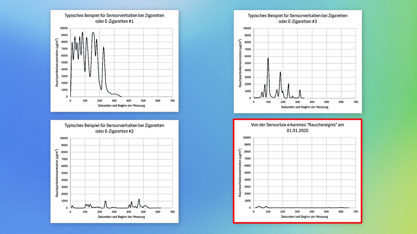 Die Nachkommastellen anzugeben ist unsinnig, denn so genau können die Sensoren höchstwahrscheinlich nicht messen. Der Verlauf der „Rauchpartikelkonzentration“ zeigt zwei Peaks mit Spitzenkonzentrationen von etwa 200 µg/m³. Wie daraus eine Gesamtmenge, die zudem fälschlicherweise als Konzentration mit 2.247µg/m³ angegeben wird, abgeleitet wurde, ist mir schleierhaft und keinesfalls richtig: Hier könnte man allenfalls die mittlere Konzentration über das Rauchereignis von etwa 1,5 Minuten (was für eine Zigarette ziemlich kurz wäre) mit etwa 100 µg/m³ angeben. Zum Vergleich: Der aktuelle Feinstaub-(PM10)-Grenzwert für ein Tagesmittel ist 50 und für das Jahresmittel 40 µg/m³; ab 2030 müssen 45 (Tagesmittel) und 20µg/m³ (Jahresmittel) eingehalten werden.