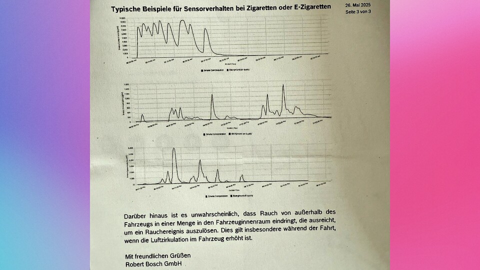 Im Zuge der Verteidigung der Sensormessungen des RideCare-Systems von Bosch hat die Firma unserem Leser unter anderem die folgenden Dokumente geschickt. Sie vergleichen typische Beispiele für das Sensorverhalten bei Zigaretten und E-Zigaretten (erstes Bild) mit den konkreten Sensormessungen in seinem Fall (zweites Bild).