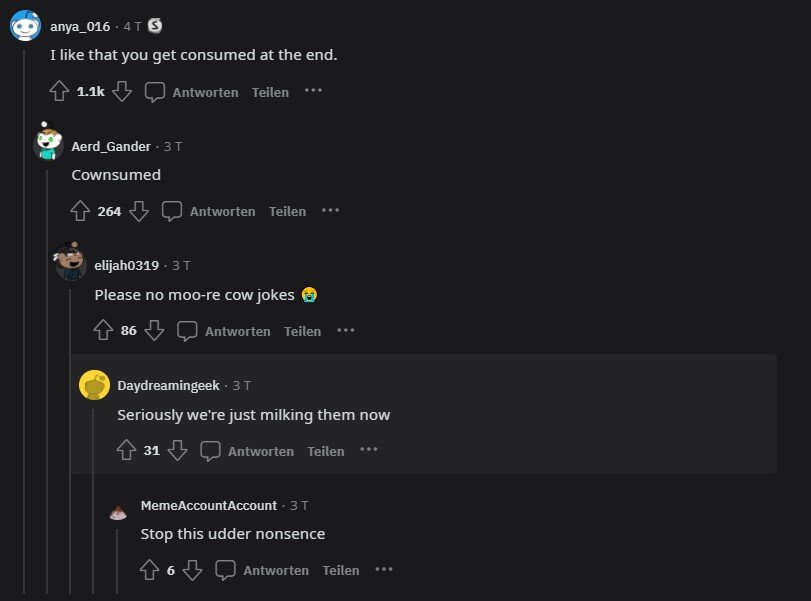 Die Kommentare bestehen zum größten Teil aus Wortwitzen mit dem englischen Wort »Cow«. Der Top-Kommentar ist ein schlichtes »Cowabunga!« - als Anspielung auf die Ninja Turtles. Es gibt zahlreiche weitere Wortwitze im Thread und die Minecraft-Community nimmt die Aktion mit Humor: