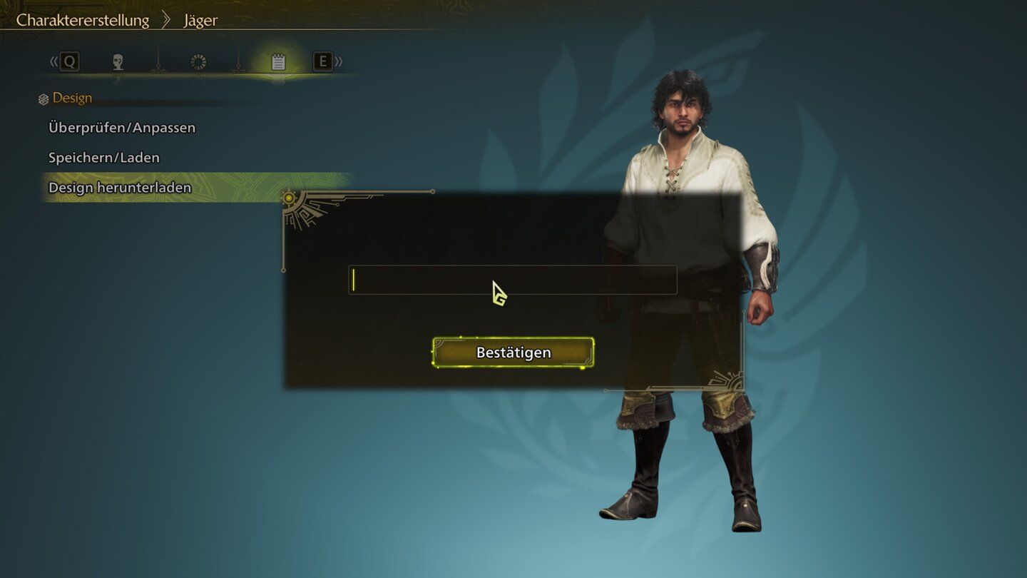 Wenn ihr im Charaktereditor seid, wechselt in den rechten Reiter. Auf dem PC geht das mit E, auf der PlayStation mit R1 und auf der Xbox mit RB. Jetzt müsst ihr auf den Menüpunkt Design herunterladen