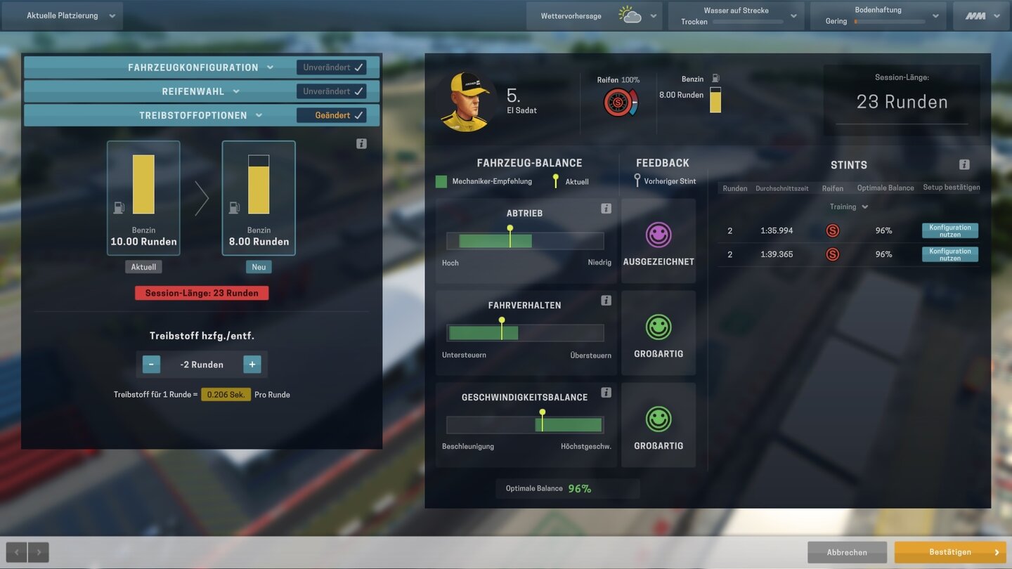 Vor dem Training schrauben wir am Winkel von Front- und Heckflügel, verstellen Getriebeübersetzungen und Aufhängung und manipulieren Radsturz und Reifendruck. Aber keine Angst, wir haben Hilfe: Je nach Konfigurationswissen (steigt im Training) und Fähigkeit des Mechanikers, bekommen wir einen grünen Bereich angezeigt, an dem wir uns orientieren.