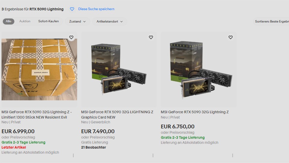 Die haben ein neues Objekt der Begierde für sich entdeckt: Wie Videocardz berichtet, ist die ohnehin schon sündhaft teure MSI GeForce RTX 5090 Lightning Z mit Preisen zwischen 7.000 und knapp 15.000 US-Dollar auf eBay gelandet.