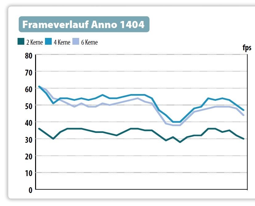 Ein ähnliches Bild bietet sich bei den minimalen fps. Selbst wenn ein Spiel mit durchschnittlich 40 Bildern pro Sekunde läuft, kann es immer mal wieder unter die Marke von 30 fps fallen und dadurch kurzzeitig ruckeln. Doch auch auf die minimale Bildwiederholrate haben die beiden zusätzlichen Rechenkerne des Sechskern-Prozessors keinen Einfluss. Mit 56,0 fps liegt der Core i7 980X hier nahezu gleichauf mit seiner Vierkern-Version (54,7 fps). Mit nur zwei Kernen sinken die minimalen Frames dagegen auf 46,4 Bilder pro Sekunde. Doch so eindeutig wie das Gesamtergebnis ausfällt, so unterschiedlich sind die Resultate in den einzelnen Spielen. Denn während zum Beispiel Crysis mehrere Rechenkerne grundsätzlich egal sind, profitiert Anno 1404 erkennbar mehr von zusätzlichen Recheneinheiten.