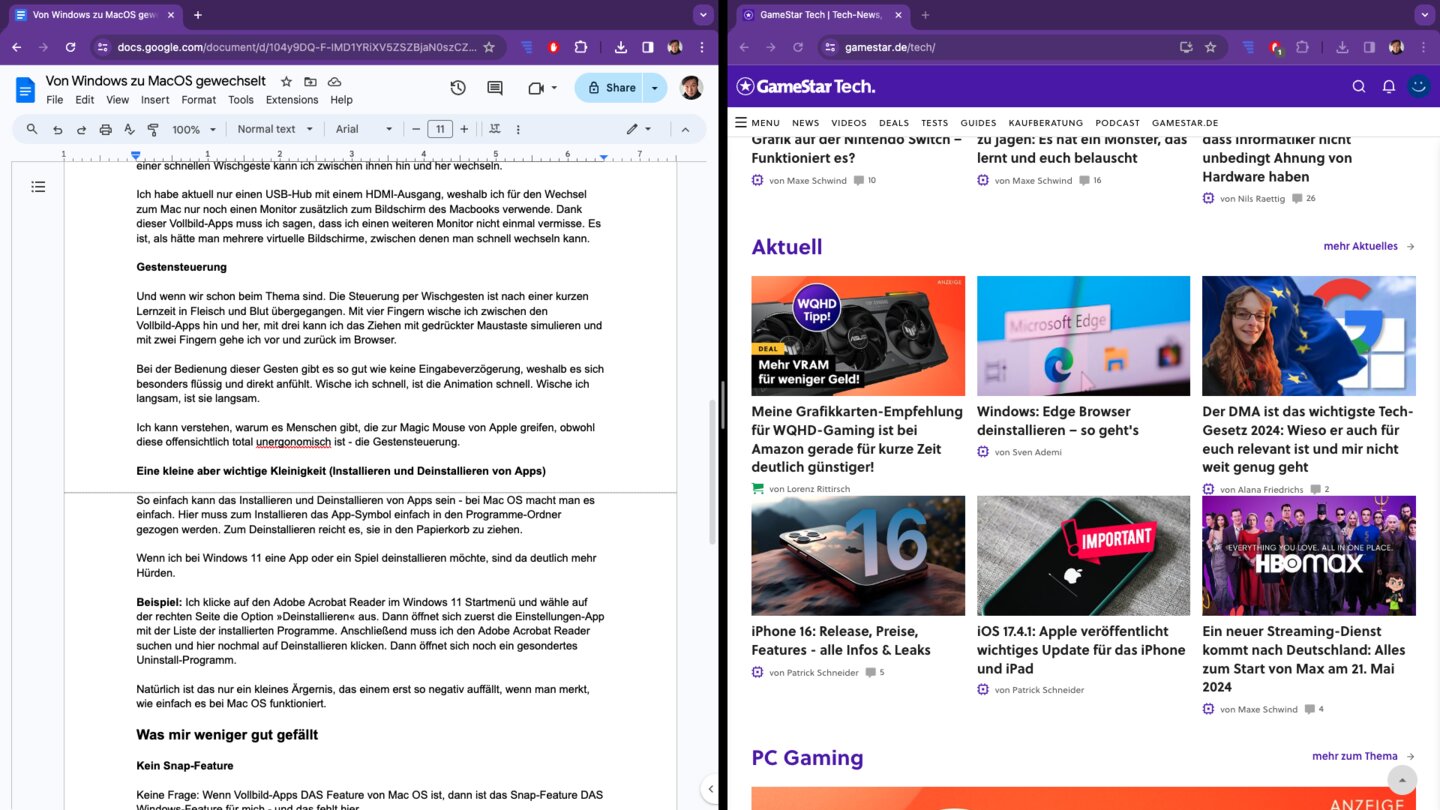 Was bringt das? Ich kann mehrere Browser-Sitzungen und Apps gleichzeitig offen haben, ohne die Übersichtlichkeit auf den Bildschirmen zu verlieren. Beispielsweise habe ich immer eine Vollbild-Anzeige mit zwei Browserfenstern offen: links Google Docs und rechts meine Quellen. Auf weiteren Vollbild-Anzeigen finde ich Photoshop, Microsoft Teams und so weiter. Mit einer schnellen Wischgeste kann ich zwischen ihnen hin und her wechseln.
