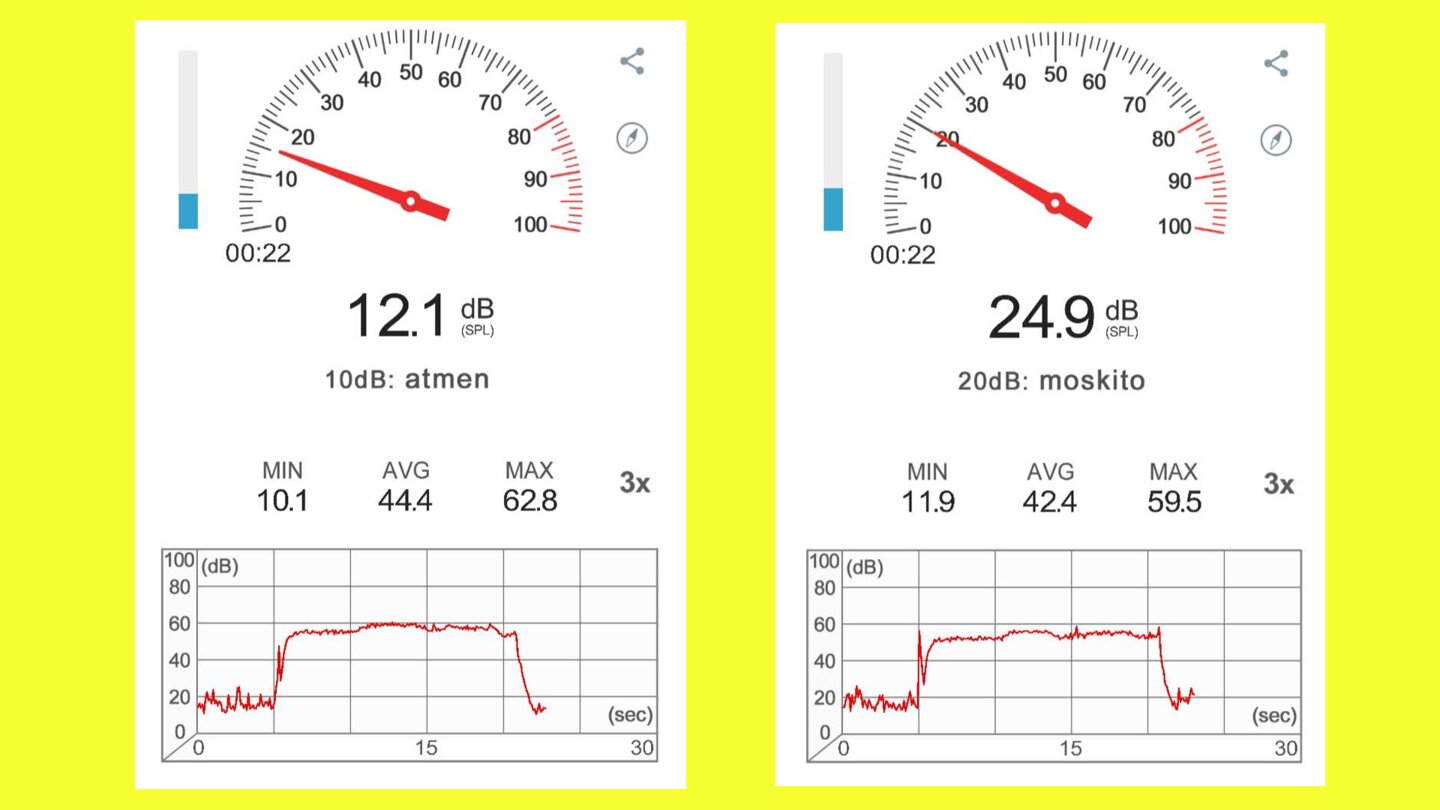 Ungeachtet der Leistungsstufe bewegen sich die Dezibel im Gerätebetrieb also knapp um die 60 Dezibel. Das entspricht laut Referenztabelle der Apps einer »Ruhigen Straße«; Die Welt vergleicht 60 Dezibel mit dem Pegel einer »Nähmaschine« oder eines »Gruppengesprächs«.