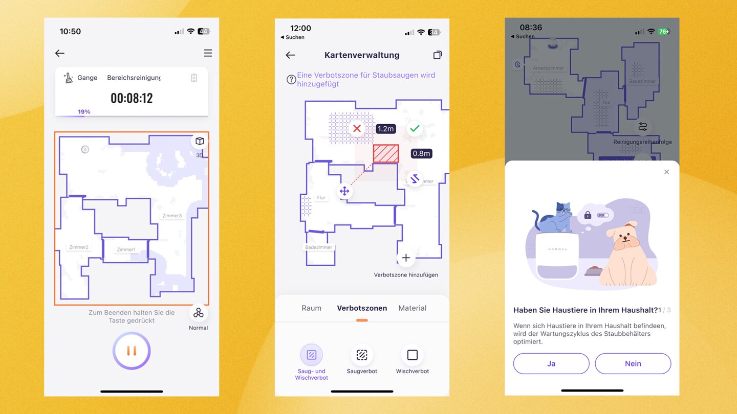 Natürlich könnt ihr Räume teilen oder zusammenlegen sowie Verbotszonen in der App festlegen - etwa, um Hindernisse zu umfahren oder gewisse Bereiche auszusparen.