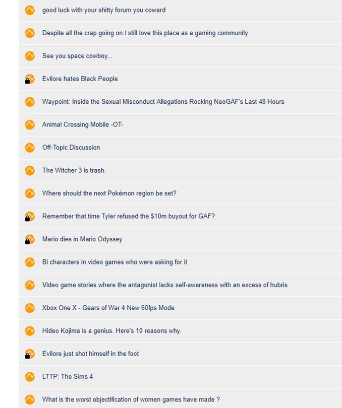 Die Ereignisse kamen ins Rollen durch einen Facebook-Post. Eine Frau beschrieb dort, wie sie gemeinsam mit einem Mann, den sie für einen Freund hielt, einen Roadtrip unternahm. Während einer Hotelnacht belästigte dieser sie und behandelte sie nach dieser Zurückweisung schroff. Zuerst wollte die Frau nicht den Namen des Mannes verraten, da er »halb-berühmt« sei und sie bisher nicht Kraft hatte, sich zu verteidigen. In den Kommentaren nannte sie aber dann das Alias: Evilore. Unter diesem Namen schreibt der Betreiber von NeoGAF, der in den letzten Jahren bereits wegen sexueller Belästigung aufgefallen sein soll.