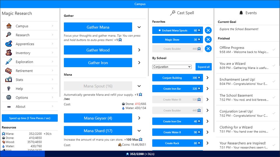 Dabei hat (auch die Steam-Version) auf den ersten Blick den Charm eines Steuerformulars. Text, Buttons, Zahlen ... ein paar Bilder. Das war's. Reicht aber! Ihr stampft eine Magierschule aus dem Boden, wählt aus unterschiedlichen magischen Elementen, craftet Ausrüstung, erkundet Dungeons, erforscht neue Zaubersprüche und automatisiert mithilfe euer wachsenden Schülerschaft. Das textbasierte Spiel hat zudem eine wirklich nett erzählte Handlung und steckt voller Überraschungen.