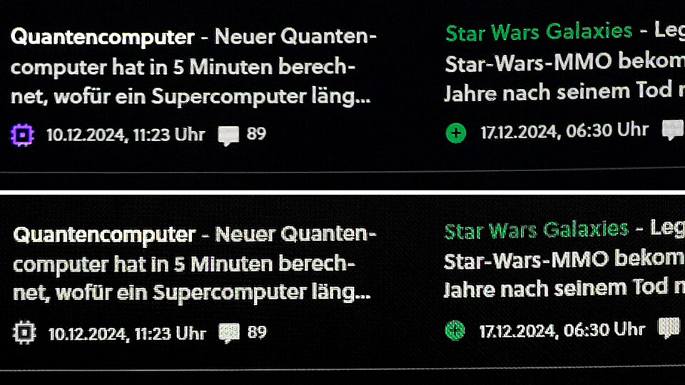Was ich damit meine, veranschaulicht das folgende Bild in meinen Augen sehr deutlich. Oben seht ihr den MSI 491CQPDE mit OLED-Panel, den ich leihweise nutzen konnte, unten meinen alten Asus XG43VQ mit VA-Panel: