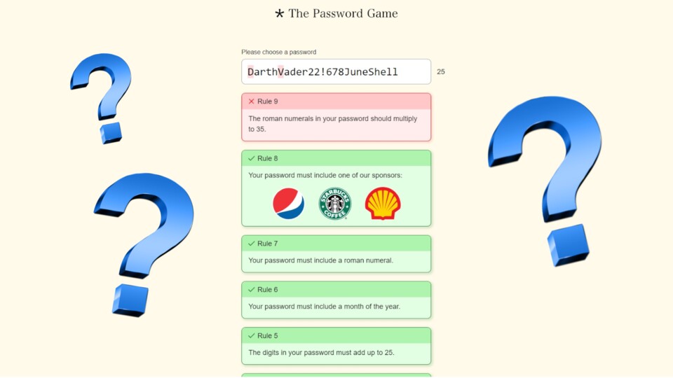 Die Regeln des Passwort-Spiels sind denkbar einfach: Ihr sollt ein sicheres Passwort erstellen. Ähnlich wie bei vielen Webseiten und Programmen gibt euch das Spiel dabei die Vorgabe, Zahlen, Buchstaben und Sonderzeichen zu kombinieren. So weit, so normal.