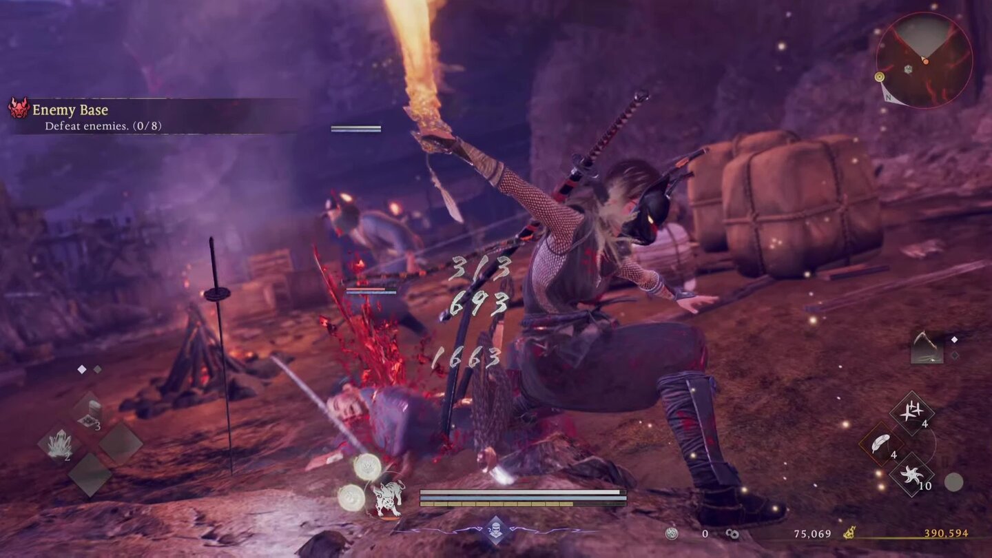 Stattdessen kämpfe ich mich in meiner Session durch einen von bösen Yokai verseuchten Ort der Bakumatsu-Periode und erfreue mich an meinem Lieblings-Spielstil: Herumwieseln und möglichst viele Gegner hinterrücks abmurksen. Denn mit dem neuen Ninja-Stil kommen auch gleich ein paar neue Features. Ich kann jetzt springen und leichter schleichen, wodurch ich wahrlich eins mit den Schatten werde.
