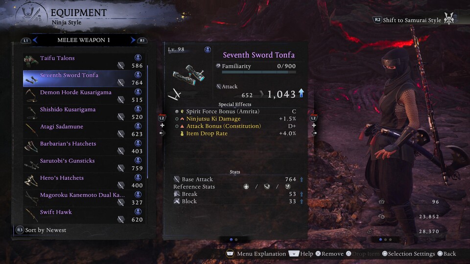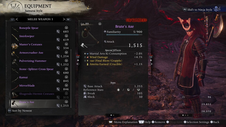 Die wohl wichtigste Neuerung ist aber die Einführung der beiden bereits erwähnten Kampfstile: Samurai- und Ninja-Stil. Zwischen beiden kann ich uneingeschränkt hin- und herwechseln. Dabei verwandelt sich nicht nur mein Bewegungs-Repertoire, sondern auch gleich mein gesamter Build samt äußerem Erscheinungsbild.