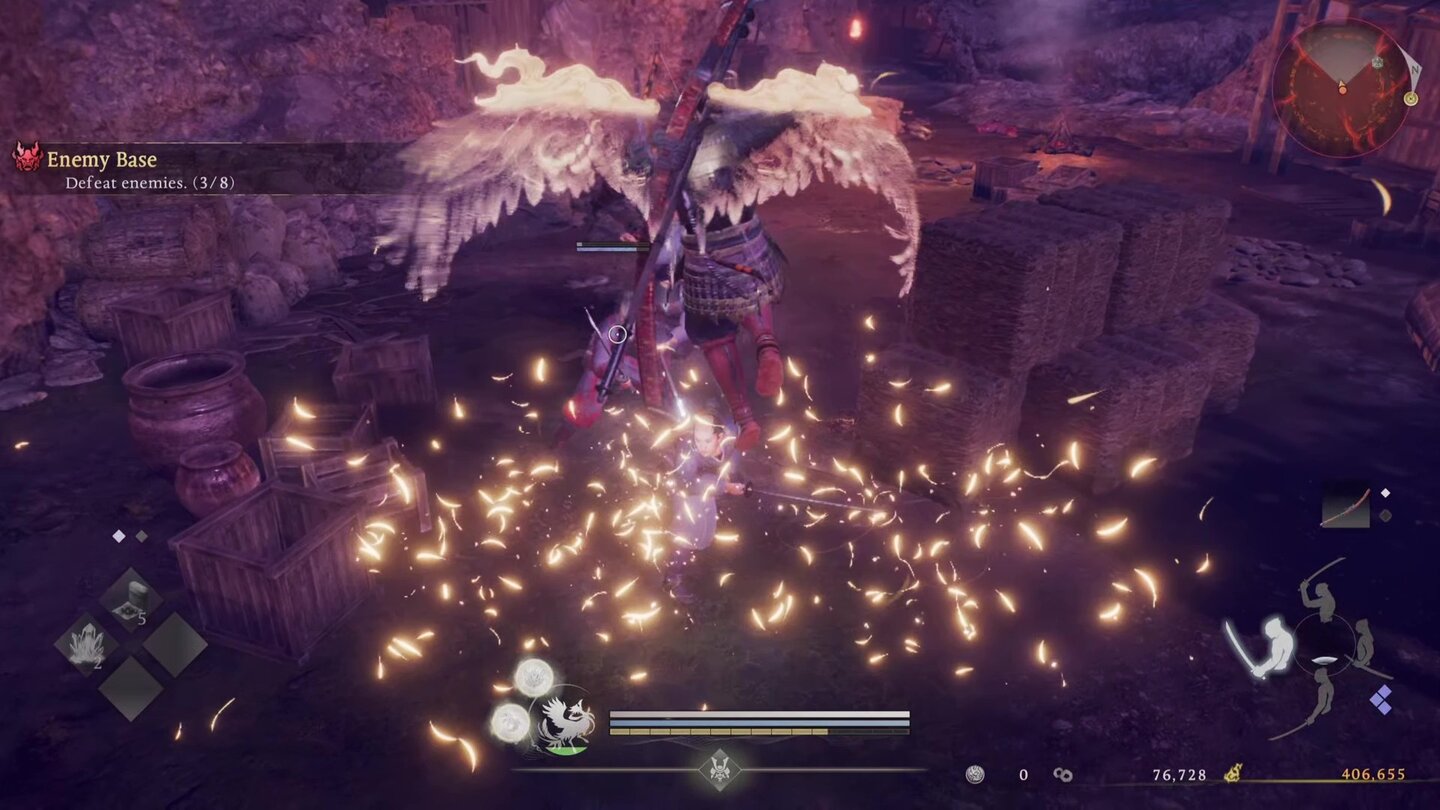 Der Ninja-Stil ist hingegen mehr auf Schnelligkeit und kluge Manöver ausgelegt. Hier gibt’s keine Haltungen mehr, stattdessen greife ich auf ein Portfolio aus Ninjutsu-Techniken wie Brandbomben und Wurfsterne zurück.