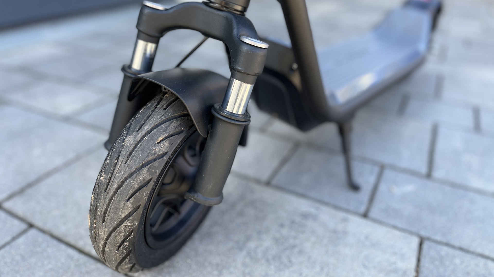 Die 9,5-Zoll-Luftreifen und die Frontfederung sorgen dafür, dass man auch auf unebenen Straßen nicht durchgeschüttelt wird. Für echte Offroad-Ausflüge ist der KQi 100P aber weniger geeignet als doppelt gefederte Modelle wie der Joyor S5.