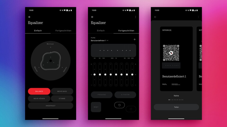 Mehr Freiheit bietet euch Nothing beim Equalizer. Neben einfachen Modi, mit denen sich Bass, Mitten und Stimmen hervorheben lassen, könnt ihr im Fortgeschrittenen-Modus die Frequenzen sowie die Breite der beeinflussten Frequenzbereiche anpassen.