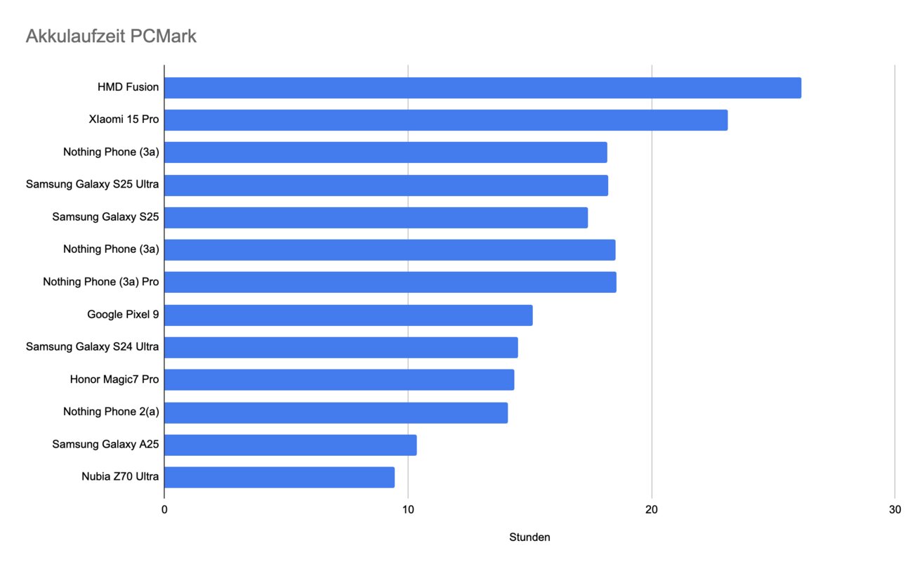 Damit liegt das Handy mit dem S25 quasi gleichauf. Eine längere Laufzeit erreichen in meinen Tests nur das S25 Ultra, das Xiaomi 15 Pro und das HMD Fusion.