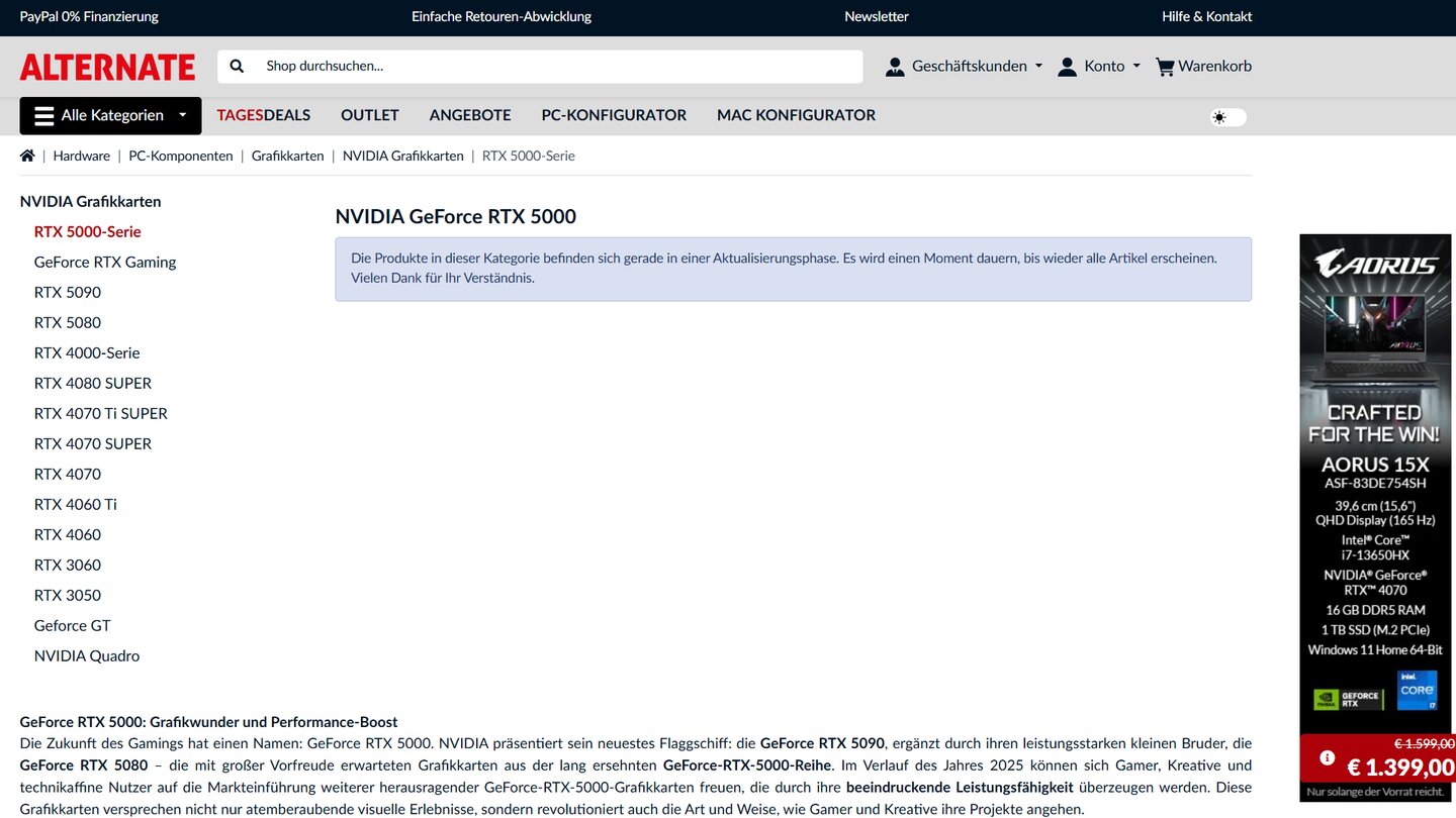 Dass es langsam ernst wird, zeigte auch der Shop Alternate, bei dem zuvor noch keine Spur von RTX 5000 auszumachen war.