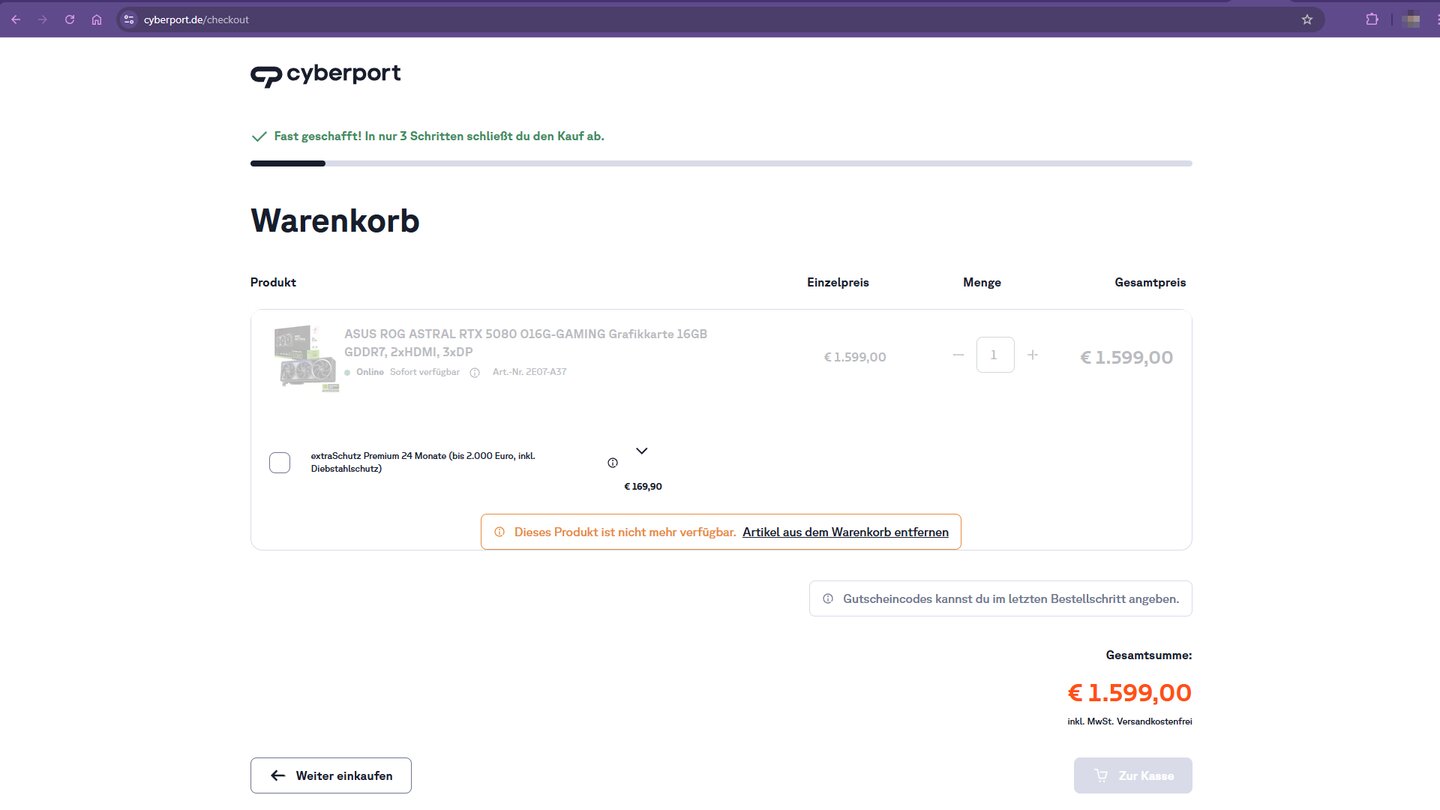 - Cyberport: In diesem Online-Store konnte ich kurzzeitig zumindest eine RTX 5080 in meinen Warenkorb packen, Halleluja! Aber bevor ich eine Chance hatte, sie zu kaufen, war die Karte schon nicht mehr verfügbar (siehe auch das Bild unten).