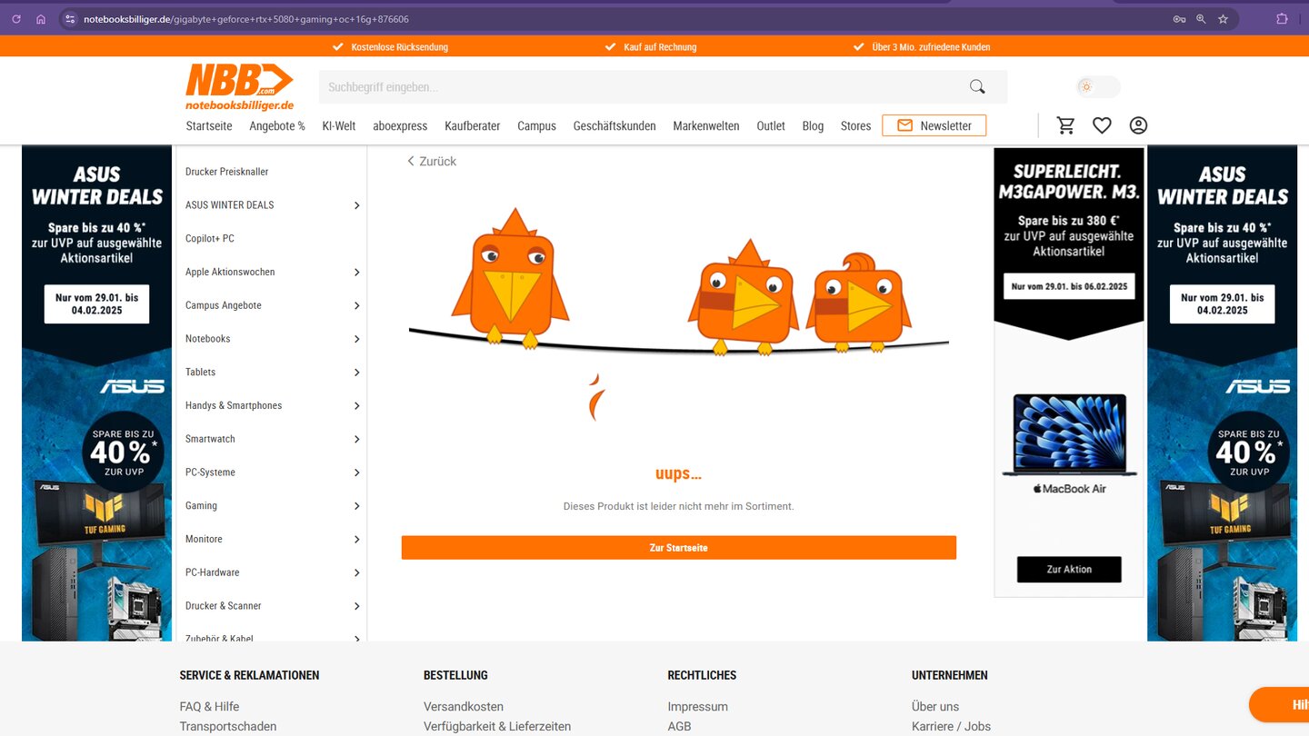 gelistet. Die Chance, eine GPU in den Warenkorb zu legen bestand aber auch später nie für mich. - Notebooksbilliger: Zuerst waren keine Karten gelistet. Kurze Zeit später tauchten sie zwar im Shop auf, aber öffnen konnte ich die Produktseiten nicht. Stattdessen kam stets eine Fehlermeldung.