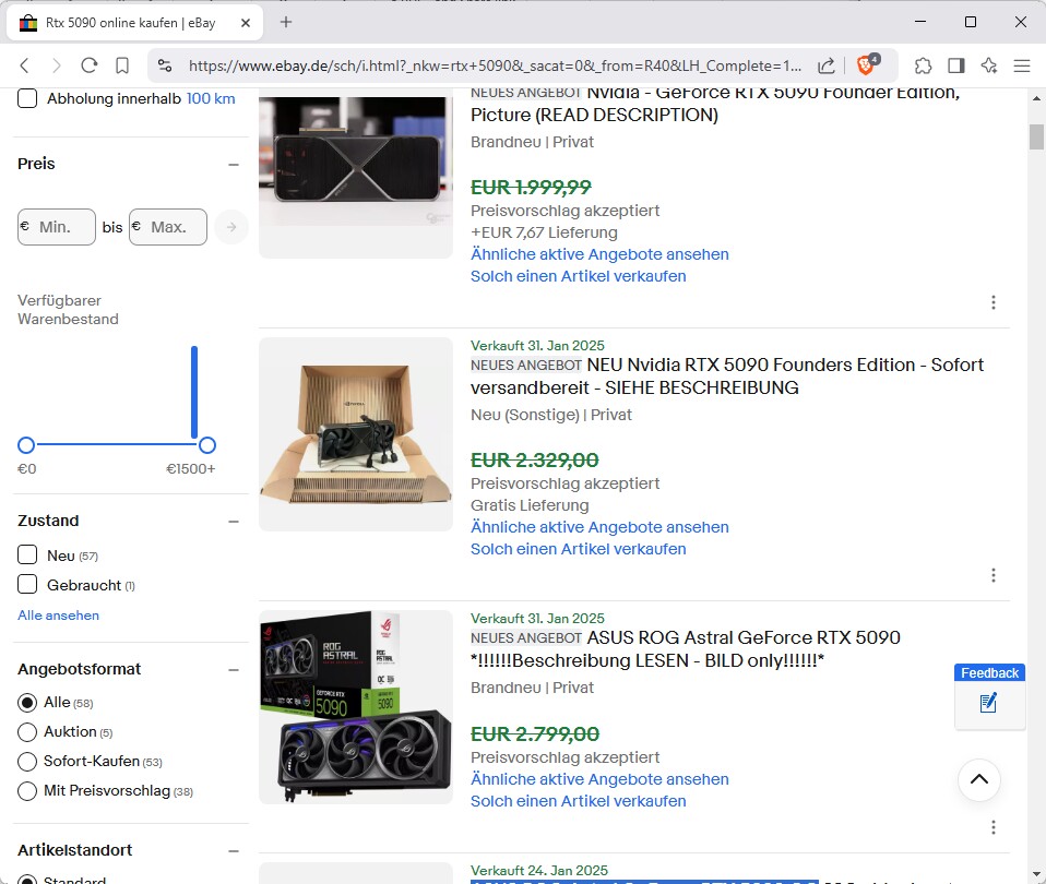 Bei den verkauften Exemplaren liegt die Spanne zwischen rund 3.300 Euro und 4.800 Euro. Hier sind mehrere Auktionen mit verkauften Fotos von RTX-5090-Grafikkarten gelistet.