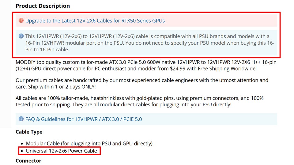 Update, 13. Februar: Moddiy hat den Beschreibungstext des betroffenen Kabels inzwischen angepasst und weist darauf hin, für den Betrieb mit einer RTX-5000-Grafikkarte zu einem der aktuellsten Kabel