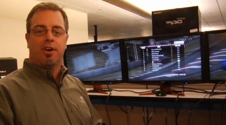 Anschließend ist eine Grafik von Nvidia zu sehen, die eine Radeon HD 5870 mit der Geforce GTX 480 im Verlauf des Benchmarks vergleicht. Dabei erreicht die ATI-Karte nur selten die Bildrate der Geforce. Zum Ende des Videos wird noch 3D Vision Surround vorgeführt.