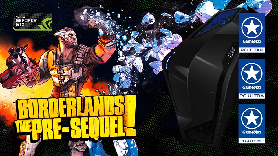 Der Gratis-Gutschein für Borderlands: The Pre-Sequel (spielbar ab 17. Oktober) liegt ab sofort allen offiziellen One GameStar-PCs mit einer Geforce-Grafikkarte ab einer Geforce GTX 780 bei. Das Angebot gilt für den absoluten High-End-Rechner One GameStar-PC Ultra mit Intels 4,0-GHz-Prozessor Core i7 4790K, Nvidia Geforce GTX 780, 16,0 GByte RAM und 250 GByte großer SSD für nur 1499 €. Ebenfalls mit dabei ist der fast schon übertrieben schnelle One GameStar-PC Xtreme mit dem gleichen 4,0-GHz-Prozessor Core i7 4790K, der extrem schnellen High-End-Grafikkarte Nvidia Geforce GTX 780 Ti, 16,0 GByte RAM und riesiger 500-GByte-SSD für nur 1799 €.
