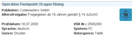 Die Militär-Simulation Operation Flashpoint 2: Dragon Rising wird in Deutschland ungeschnitten und mit einer Altersfreigabe ab 16 Jahren erscheinen. Die Unterhaltungssoftware Selbstkontrolle (USK) hat die Altersfreigabe auf ihrer Internetseite bekannt gegeben (siehe Bild). Dass es sich bei der getesteten Version von Operation Flashpoint 2: Dragon Rising um eine ungeschnittene Version handelt, geht aus einem Forumbeitrag des deutschen Community Managers von Publisher Codemasters hervor.