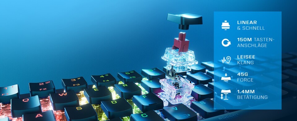 Das Herzstück sind die exklusiven Titan II optischen Schalter von Roccat. Diese linearen Schalter bieten eine ultraschnelle Betätigung und eine unglaubliche Haltbarkeit von 150 Millionen Klicks. Das bedeutet, dass ihr auch in hitzigen Gaming-Sessions stets präzise und zuverlässig agieren könnt, ohne euch Gedanken über die Langlebigkeit eurer Tastatur machen zu müssen.
