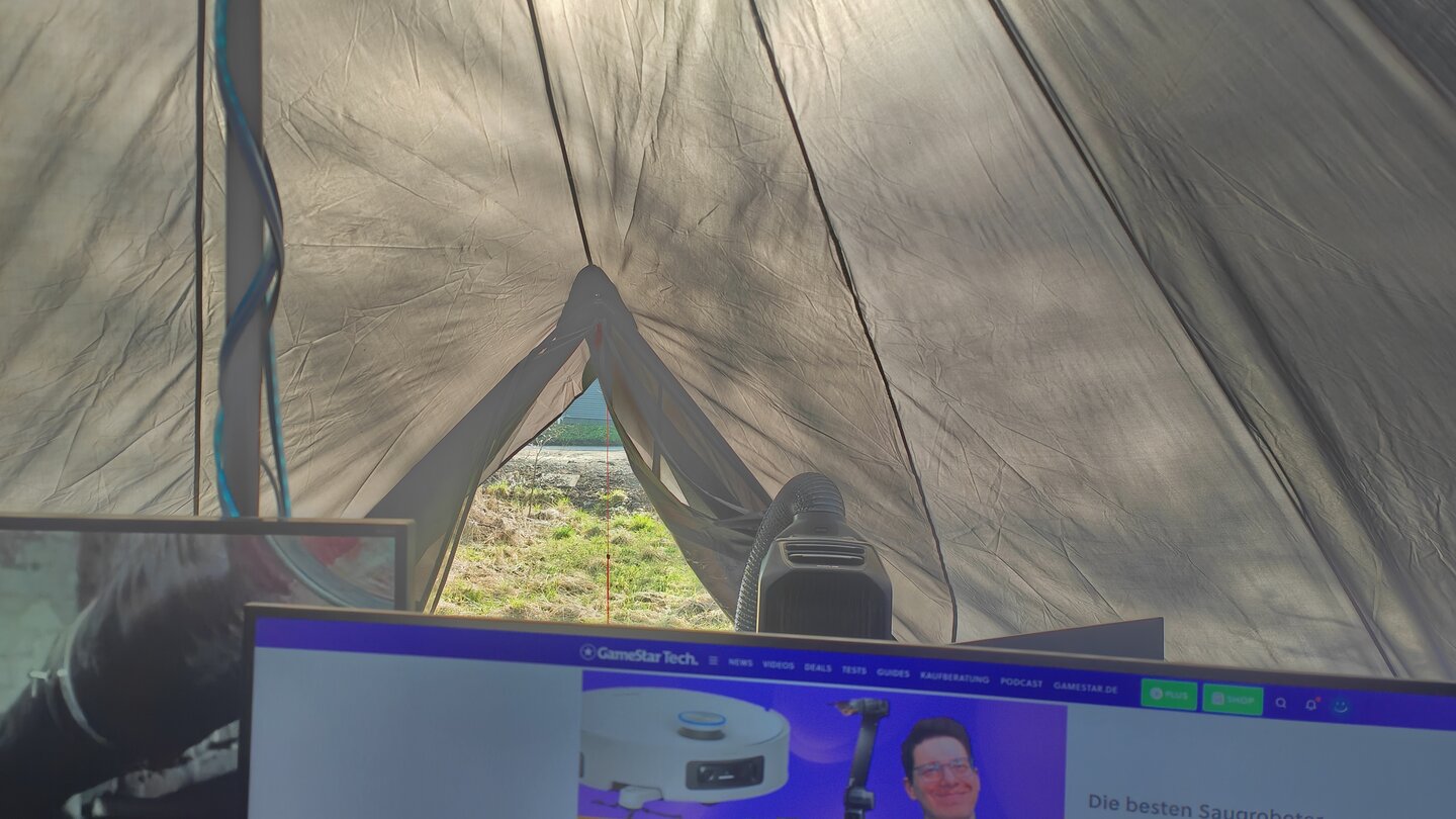 Kniffliger war die WLAN-Situation: Das Zelt steht nur noch grob in Sichtweite zum im Dachgeschossfenster platzierten Routers, der das Glasfasernetz weiterleiten sollte. Sollte - an einigen Tagen waren 500 Mbit/s drin, an anderen nur 10 - und das ist dann doch schon arg wenig, vor allem weil auch die Latenzen unangenehm anstiegen. Die Abhilfe schaffte eine leistungsstärkere WLAN-Antenne für den PC, die dank Kabel flexibel positionierbar war und ein leistungsstärkerer WiFI6-Access-Point.