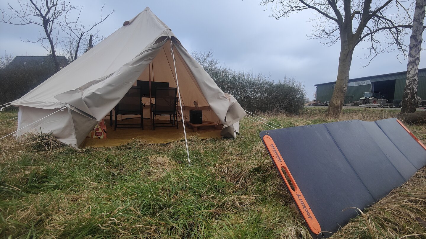 Die ersten Abende im Zelt waren geprägt von der Freude über das Urlaubsgefühl, das sich bereits wenige Meter vom Haus entfernt einstellte. Für die Stromversorgung stand eine Powerstation mit einer Kilowattstunde Kapazität bereit, die tagsüber per Solarpanel aufgeladen wurde.