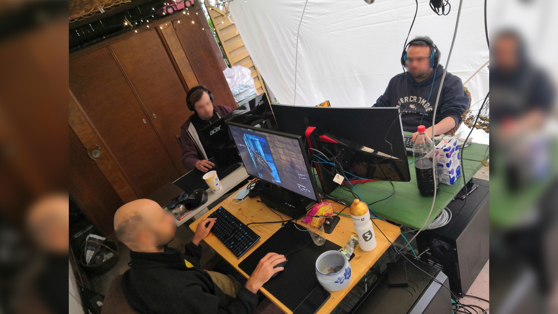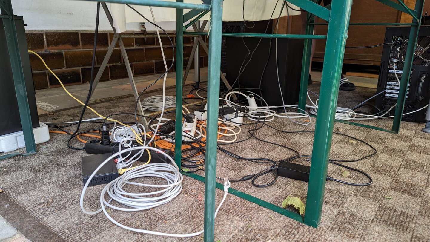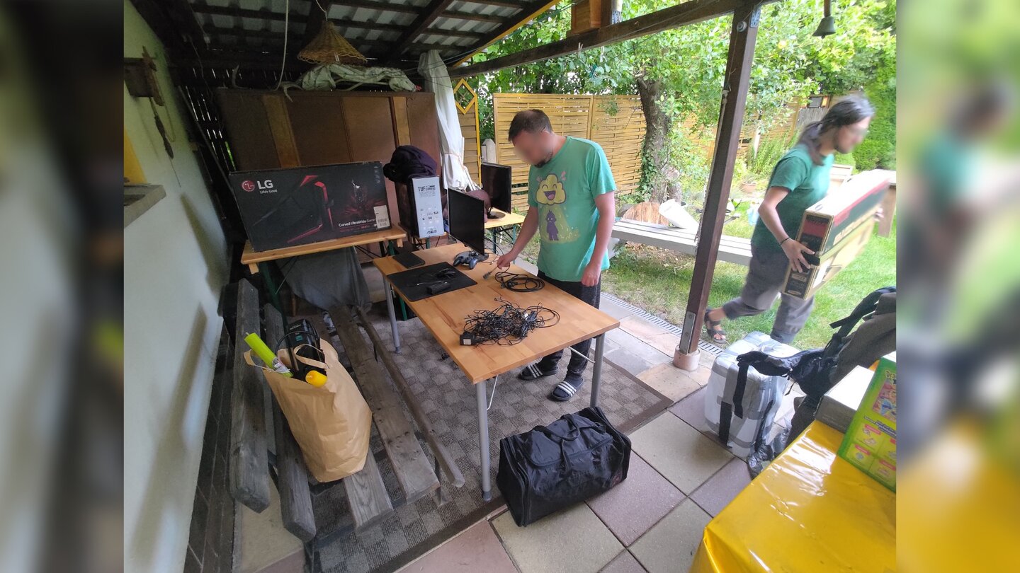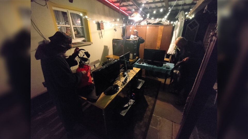 Die anderen beiden spielen währenddessen weiter. Ihre Technik und die Tische mit den Monitoren darauf stehen unter einem kleinen Terrassenvordach, wenige Meter entfernt. Zur Wetterseite hin ist eine Plastikfolie gespannt.