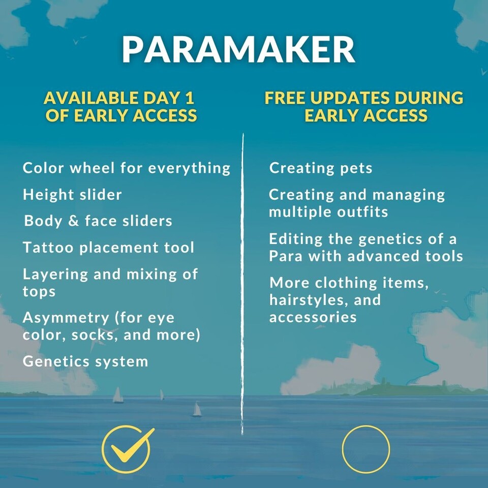 Anders als bei anderen Roadmaps gibt das Team aber noch keine konkreten Timings an. Die dort aufgeführten Features sollen nur irgendwann im Verlauf des EA folgen. Das kann nach einigen Wochen sein, vielleicht aber auch erst in mehreren Monaten. Wie lange Paralives im Early Access bleiben soll, ist noch unklar. Hier sind aber schon einmal die geplanten Features: