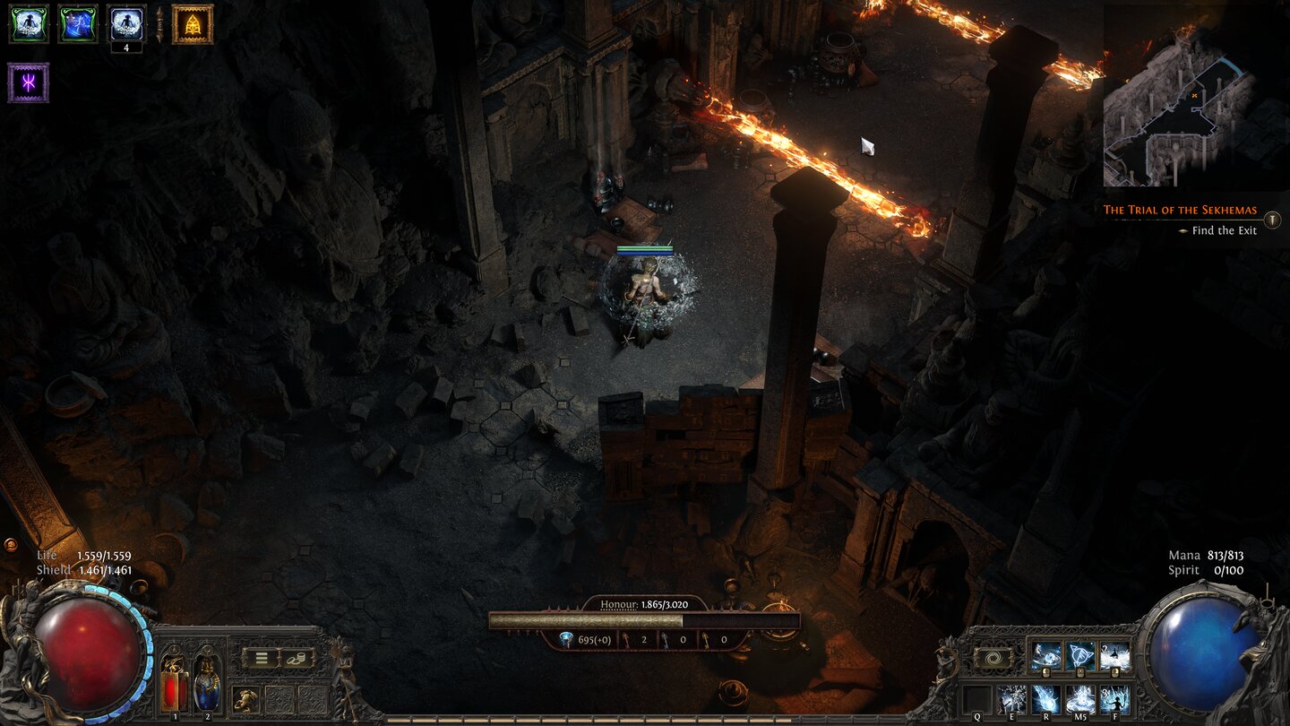 - Statische Fallen: Dass euch ab und zu ein Orb auf den Kopf fällt oder aus toten Gegnern Schadensgeister aufsteigen, die euch verfolgen, ist sehr einfach kompensierbar, denn beidem lässt sich im Moment der Explosion noch ausweichen. Statische Fallen wie der Vaal-Mechanismus oder die Laser sind aber spätestens in der Boss-Arena eine Katastrophe. Die kleinen Feuer-Geschütze sind noch zu verkraften, wenn es gar nicht anders geht.