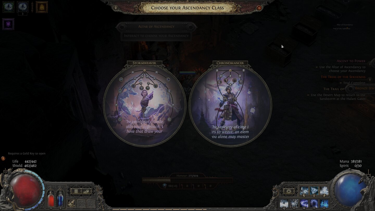 Mit etwas Glück und der richtigen Auswahl an Nachteilen solltet ihr hier deutlich leichter und schneller zu eurer Aszendenzklasse kommen als bei der Prüfung der Sekhemas. Weitere Aszendenzpunkte erhaltet ihr dann, sobald ihr im nächsten Schwierigkeitsgrad und mit höherem Level verbesserte Zugangsschlüssel findet (oder doch noch die jeweils andere Prüfung durchlauft).