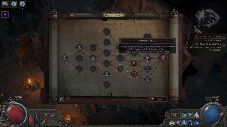 Je nach Raumauswahl kann die Prüfung der Sekhemas zu einem absoluten Frustfest verkommen. Die wertvollste Lektion ist also: Ihr müsst sie nicht machen. Wenn euch die Prüfungen des Chaos mehr liegen, lassen sich auch sämtliche Aszendenzpunkte dort freischalten.