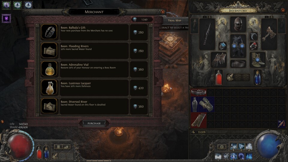 - Heiliges Wasser: Bestimmte Räume und Gegner gewähren euch Heiliges Wasser, mit dem ihr in Händler-Räumen (für die Dauer der Prüfung) permanente Segen kaufen oder Malusse (Nachteile) entfernen lassen könnt.