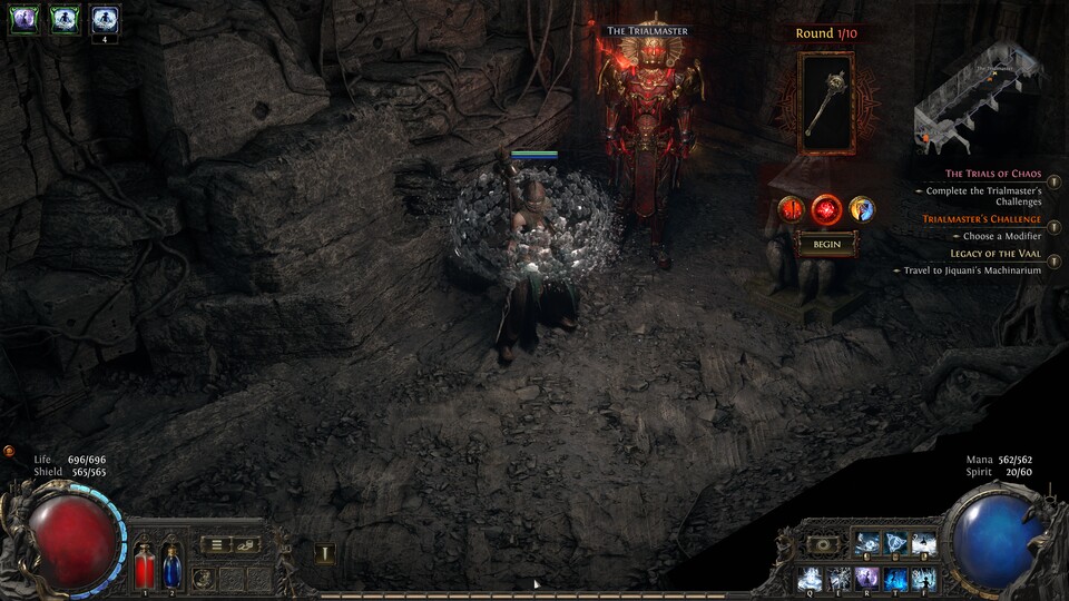 Die Prüfungen des Chaos sind in vielerlei Hinsicht einfacher. Für den Zugang müsst ihr im dritten Akt nur am Kartenrand der Feuchtlande der Chimären nach dem Zonenübergang zum Tempel des Chaos suchen. Zum Starten der Prüfung entreißt ihr zufälligen Gegnern eine »Inschrift des Ultimatums« und setzt sie am Altar ein. Einen garantierten Drop gibt es von der Chaos-Statue in Utzaal (später Akt 3).
