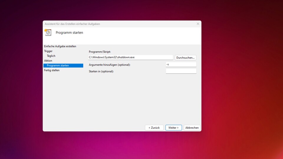 und sucht nach der shutdown.exe, die sich im folgenden Pfad befindet: C:\Windows\System32\Shutdown.exe - Im Feld