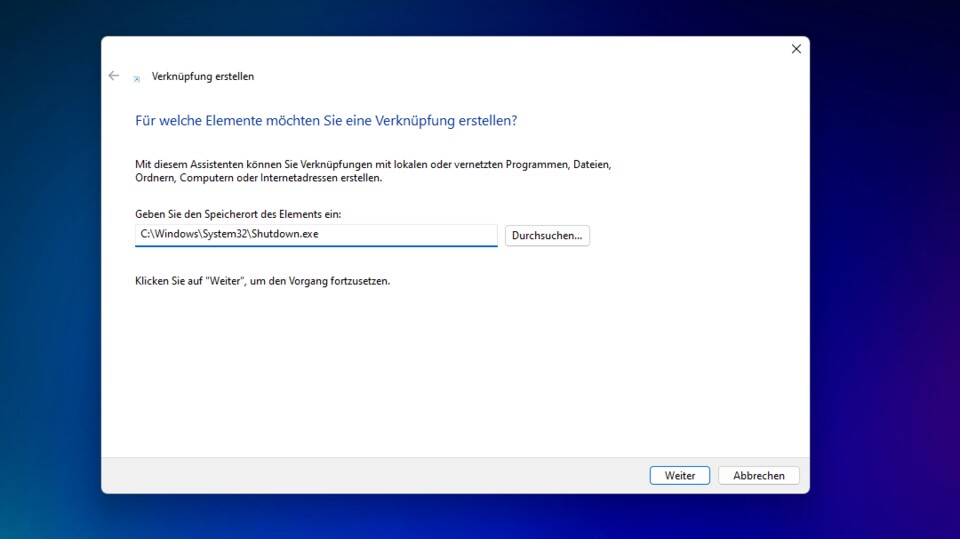 . - Es erscheint ein Fenster, das euch fragt, für welche Elemente ihr eine Verknüpfung erstellen wollt. Hier wollen wir die shutdown.exe angeben, die sich im folgenden Pfad befindet: C:\Windows\System32\Shutdown.exe