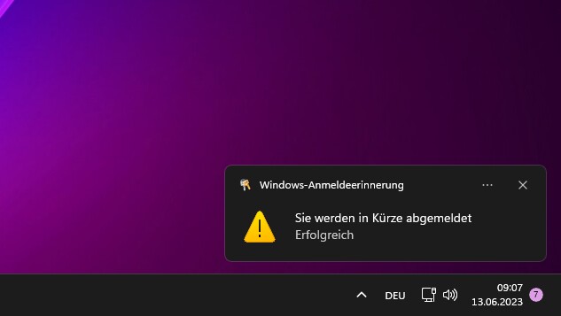 Nach Bestätigen des Befehls wird euch Windows direkt mit einer Benachrichtigung darüber informieren, dass euer PC bald automatisch abgeschaltet wird.