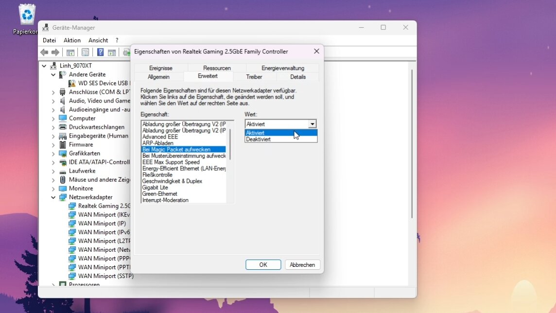 - Sucht in der Liste nach »Bei Magic Packet aufwecken« und aktiviert die Einstellung.