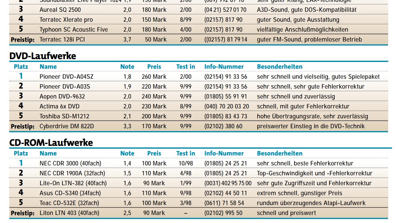 eine CD bei, genauer gesagt bis zur Ausgabe 06/2001 (vielen Dank an Martin Deppe, der diese Info wie aus der Pistole geschossen liefern konnte). - Im Einkaufsführer des Hardware-Teils waren DVD-Laufwerke aber bereits eine eigene Rubrik. Kostenpunkt für die empfohlenen Modelle: 170 bis 260 Mark (siehe auch das Bild oben).