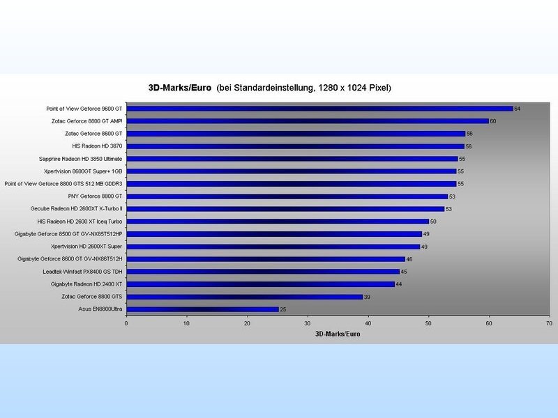 Der 3D-Mark 06 ist zwar weit verbreitet, seine Aussagekraft beschränkt sich aber auf die DirectX-9-Tauglichkeit einer Grafikkarte. Die Point of View Geforce 9600 GT erreichte bei der 1280er-Auflösung 10.926 3D-Marks. Damit liegt sie von der theoretisch erreichbaren Leistung zwischen einer Geforce 8800 GTS 320 MB (ab 220 Euro erhältlich) und einer Geforce 8800 GT (ab 240 Euro).