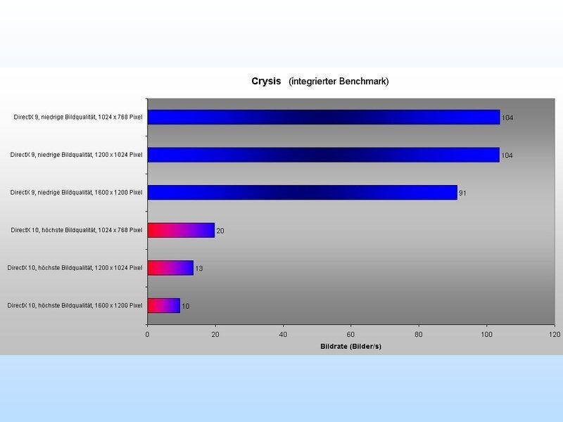 DirectX-10-Härtestet: Ähnlich wie bei World in Conflict verhält es sich auch in dem DirectX-10-Vorzeigespiel Crysis aus dem Hause Crytek. Im wenig aufwendigen DirectX-9-Modus und bei niedriger Bildqualität schießt die Bildrate auf über 100 Bilder/s – mehr als 30 bis 40 Bilder/s sind purer Luxus. Schrauben Sie die Einstellungen zur Bildqualität aber nach oben, dann kracht die Bildrate in den Keller und das Bild fängt an zu ruckeln. Selbst 1024 x 768 Pixel sehen Sie dann durchschnittlich nur mit 20 Bildern/s – das macht keinen Spaß. Um ein flüssiges Spielgeschehen auf 1280 x 1024 Bildpunkten genießen zu können, müssen Sie also beispielsweise in den Bildeinstellungen von „sehr hoch“ auf „hoch“ zurückschalten.