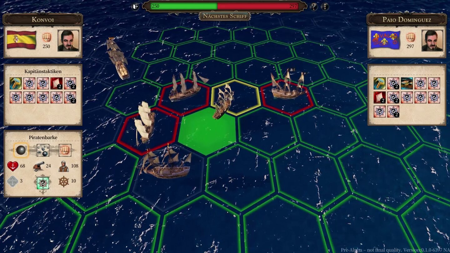 Parallel dazu steht die Fraktionswahl an, in der Karibik des 16. Jahrhunderts seid ihr für die Seefahrernationen England, Spanien, Frankreich oder Niederlande unterwegs, alle jeweils mit einer Besonderheit wie geringeren Baukosten oder besseren Angriffs- und Verteidigungswerten der Kriegsschiffe.
