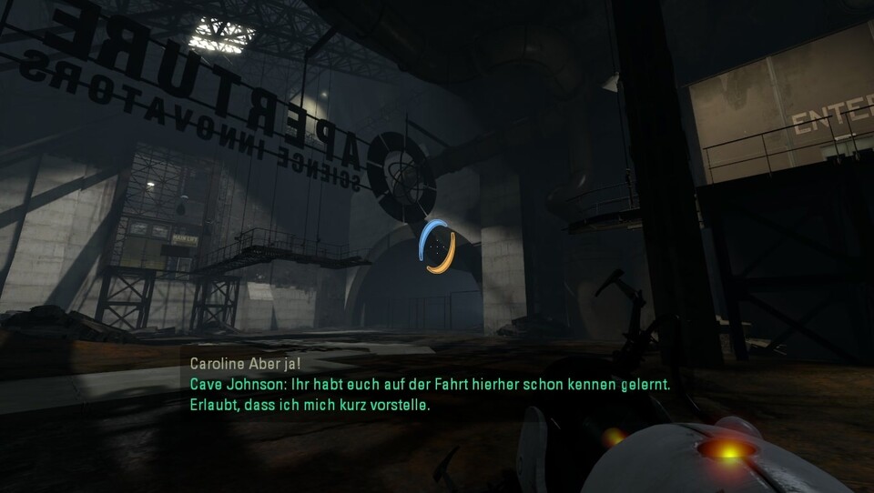Es folgt eine weitere Halle, in der ein verrosteter Aperture-Schriftzug von der Decke ragt. Hier werden Sie von Cave Johnson begrüßt und müssen den Raum auf der rechten Seite erreichen, über dessen Tür »ENTER« steht. Versuchen Sie dafür auf die Metallbalken auf der oberen rechten Ecke der Halle zu kommen. Oben angekommen, platzieren Sie ein Portal auf der Schrägen und ein Portal auf der weißen Fläche auf dem Boden, sodass Sie zum Zielraum geschleudert werden (Bild 2). Durchqueren Sie die Begrüßungsräume und fahren Sie mit dem Aufzug nach oben.